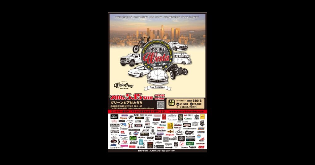 名称: Westa HIROSHIMA / THE Waterfront REUNION日時: 2016年5月15日 (SUN)場所: 広島県呉市 グリーンピアせとうち詳細: Westa HIROSHIMA 事務局 協賛させて頂きます今...